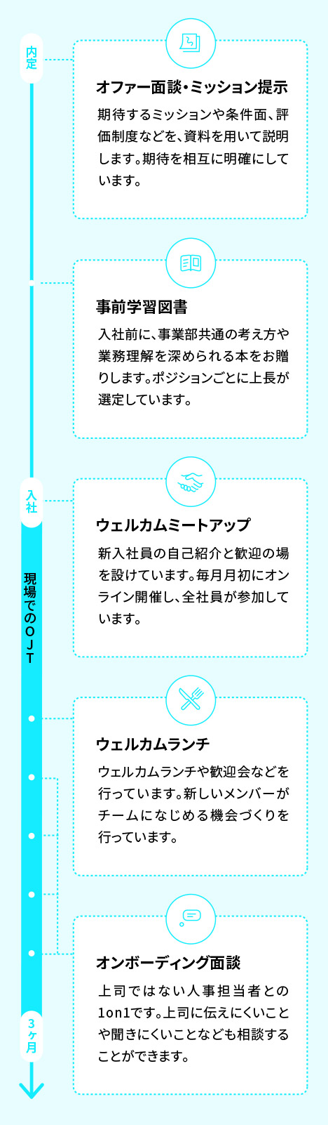 オリエンテーション後は、現場に配属されてのOJTがメインとなります。また、入社3ヶ月間で人事によるフォローアップ面談が最大5回あります。